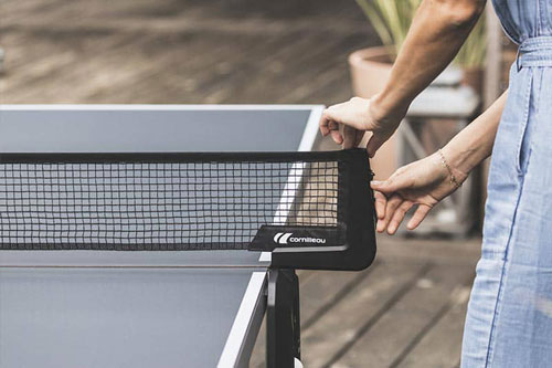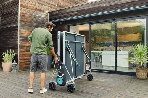 Miza vključuje tudi nastavljivo mrežo po napetosti, ki se namesti ob straneh in je ni potrebno odstraniti, ko mizo zložimo. Zložena miza porabi malo prostora, za prestavljanje ima kolese pri čemer sta 2 opremjena z zavorami, da je miza čimbolj stabilna in varna.