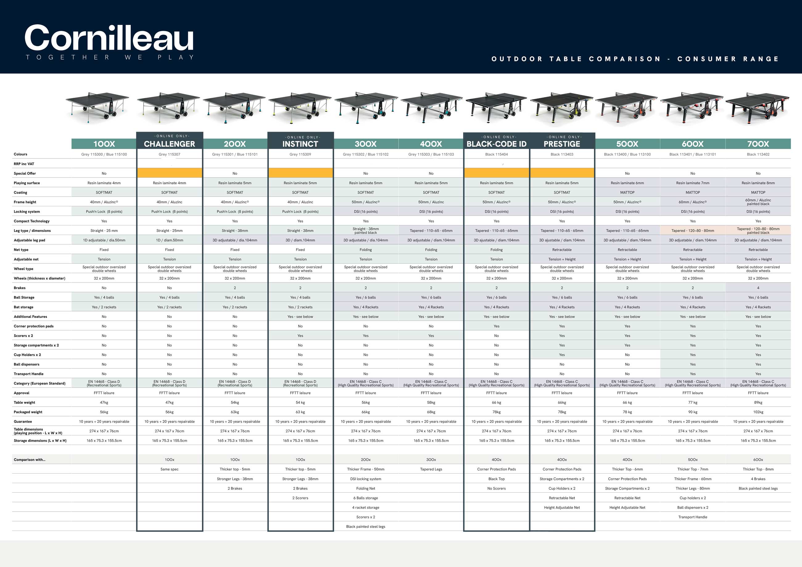 Miza Cornilleau 400X ima noge nastavljive po višini in velika kolesa, ki omogočajo vožnjo po vsakem terenu. V novi izvedbi so dodali števce točk, ki vam bodo omogočili, da se boste maksimalno skoncentrirali na tekmo.
