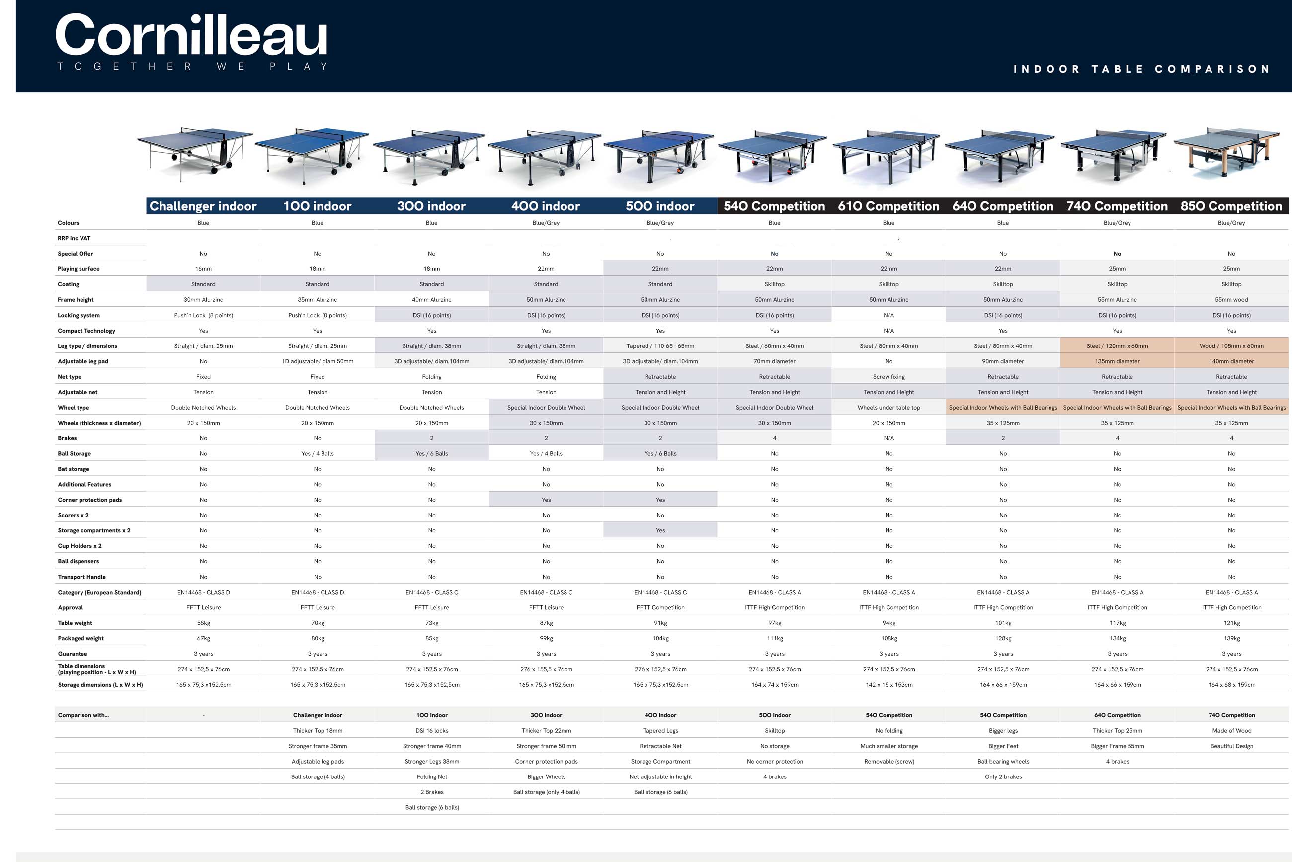Pri teh mizah je Cornilleau uporabil ves svoj "know-how" in izdelal najboljše mize za najbolj zahtevane igralce. 25mm Igralna plošča uporablja poseben SKIL TOP premaz, ki zagotavlja ustrezno hitrost, rotacijo (spin), odličen odboj in vrhunske igralne lastnosti.