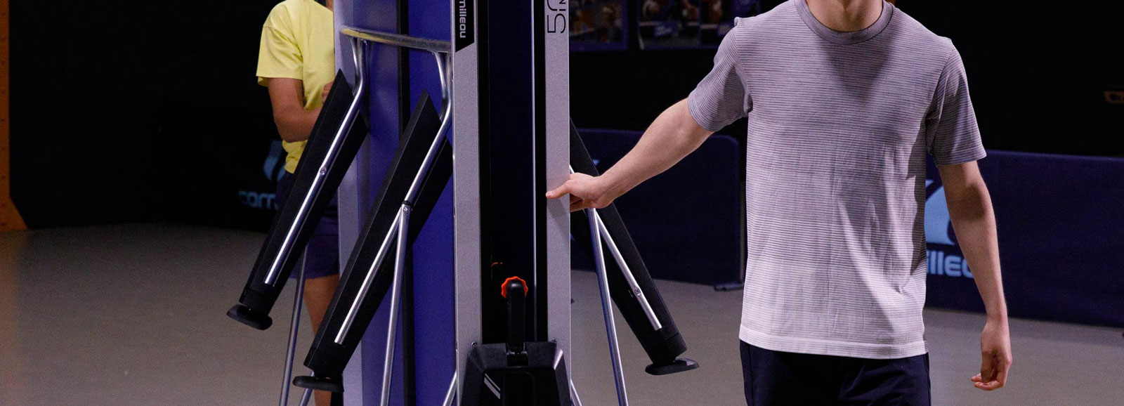 Dvojna kolesa mize 500 Indoor omogočajo enostavno premikanje po različnih notranjih površinah. Njihov material in oblika preprečujeta kakršno koli tveganje za poškodbo mehkih tal, kot so tla v športnih dvoranah.