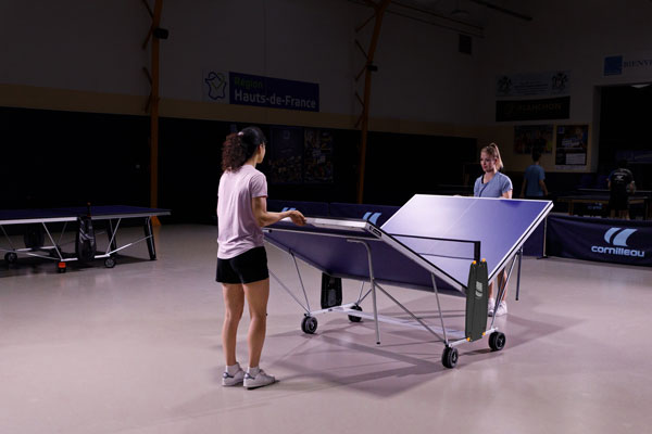 Preprosta, a učnikovita dvojna kolesa mize Challanger Indoor omogočajo enostavno premikanje po različnih notranjih površinah. Njihov material in oblika preprečujeta kakršno koli tveganje za poškodbo mehkih tal, kot so tla v športnih dvoranah.